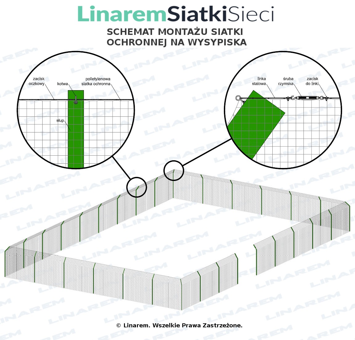 Siatka ochronna nie chłonie wody, nie zamarza, jest odporna na promieniowanie UV oraz zmienne warunki atmosferyczne, dzięki czemu znakomicie sprawdzi się w użytkowaniu całorocznym. Węzły siatki stabilizowane są na gorąco, co uniemożliwia rozplątywanie splotów, co czyni ją bardzo stabilną i nierozciągliwą.