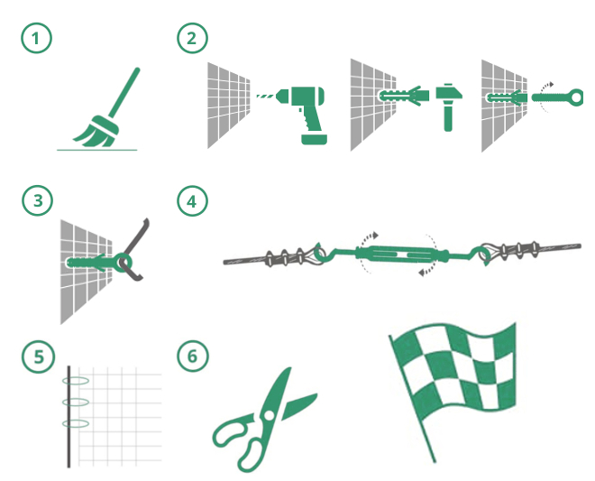 • 5. Siatkę zamocuj do utworzonej ramy z liny stalowej za pomocą opasek zaciskowych.