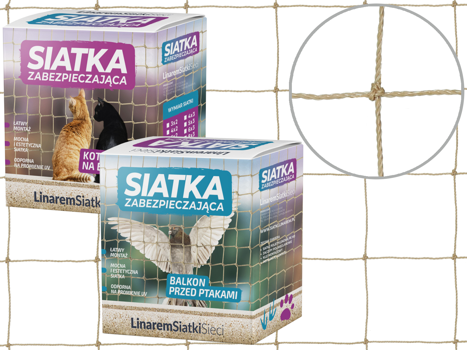Dostępna w zestawie siatka polietylenowa o oczkach 50 x 50 mm doskonale sprawdzi się do zabezpieczenia przed gołębiami i ochrony dużych kotów o spokojnej naturze.