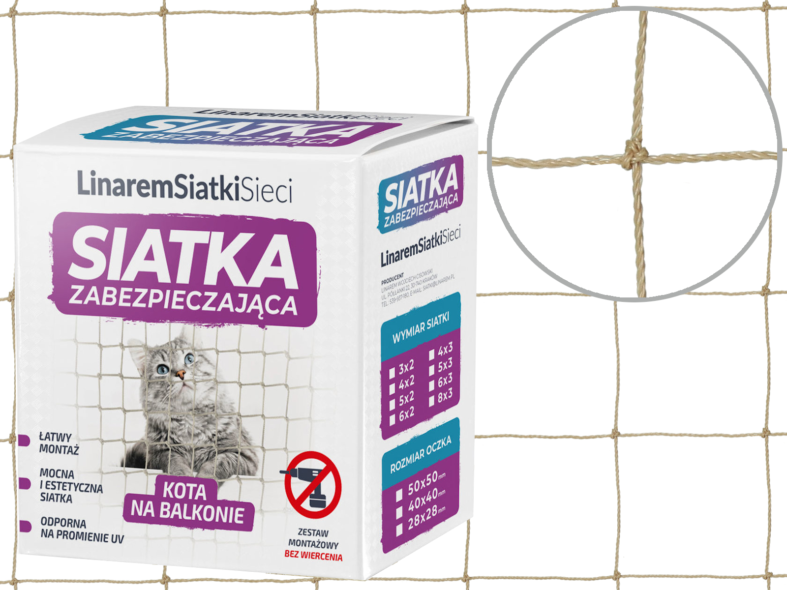 ✓ Siatki i zestawy z siatką 28x28mm - siatka gęsta o mniejszym oczku i standardowej grubości sznurka przeznaczona dla mniejszych kotów. Kompromisowe rozwiązanie pod względem bezpieczeństwa między siatką standardową a grubszymi wariantami. Sprawdza się również do zabezpieczeniami balkonu przed mniejszymi ptakami;
