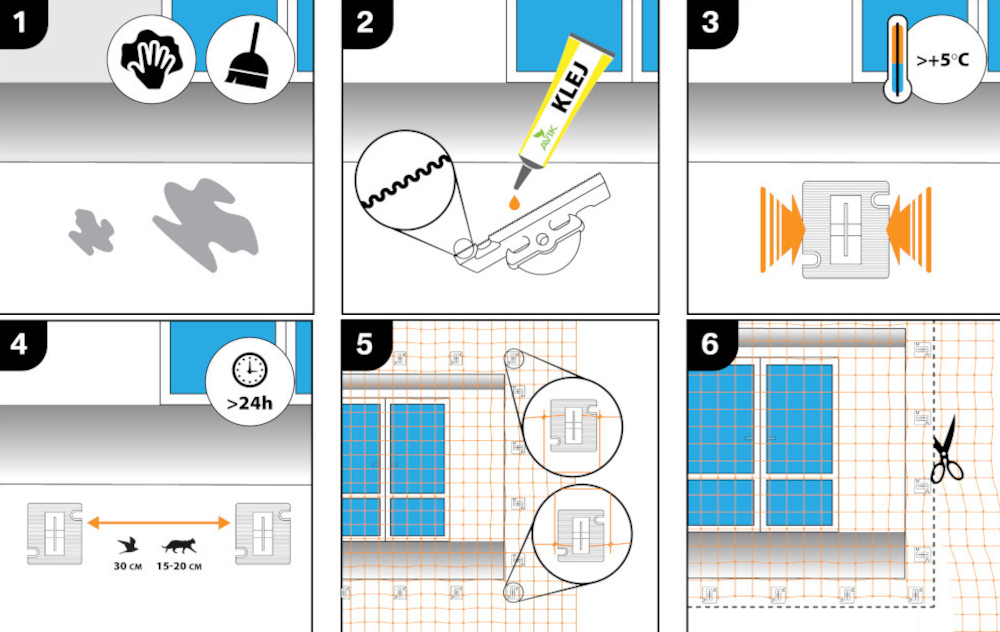 Klej idealnie sprawdza się do łączenia poliwęglanowych zaczepów AVIK do ściany tworząc solidną, spójną i wytrzymałą konstrukcję do zamocowania siatki ochronnej.