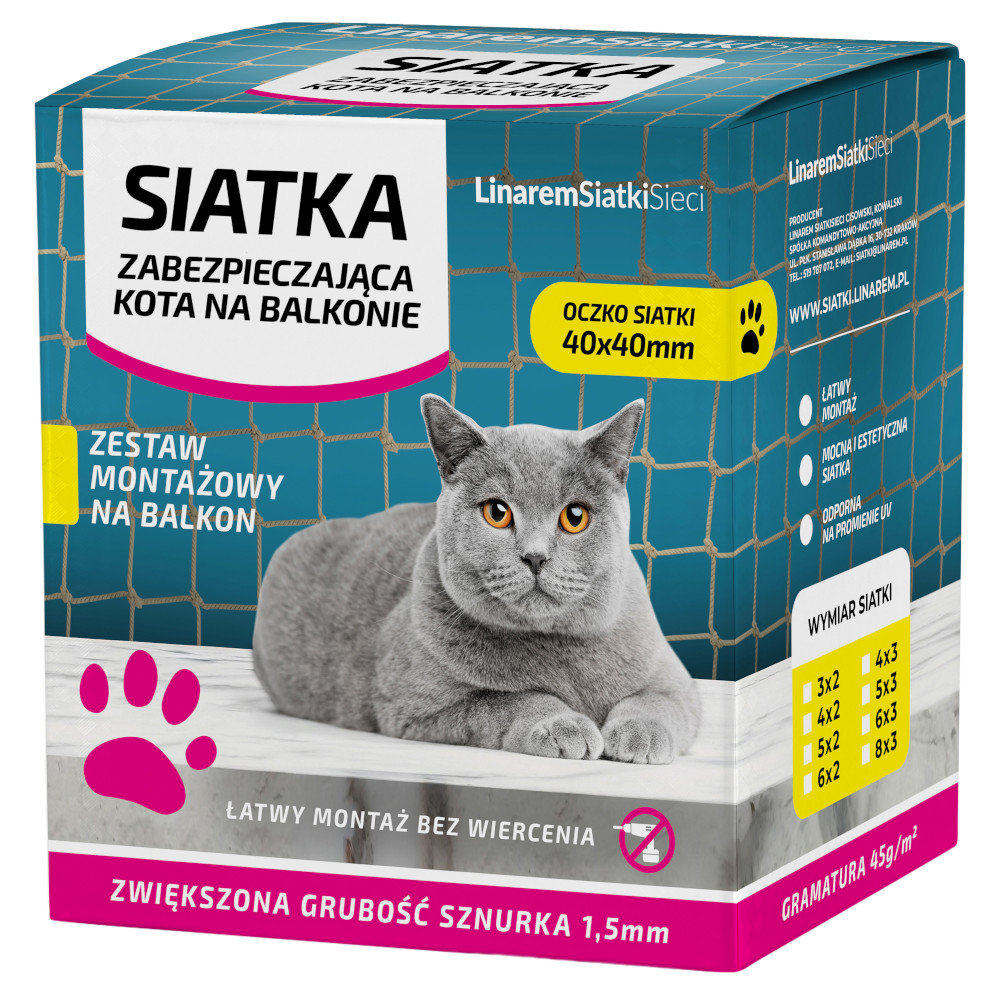 Dostępna w zestawie siatka polietylenowa o oczkach 40 x 40 mm doskonale sprawdzi się do zabezpieczenia każdej przestrzeni przed najbardziej aktywnymi kotami. Dzięki najgrubszemu dostępnemu splotowi (1,5 mm) siatka jest niezwykle odporna na wszelkiego rodzaju kocie figle, wspinaczki i zabawy.
