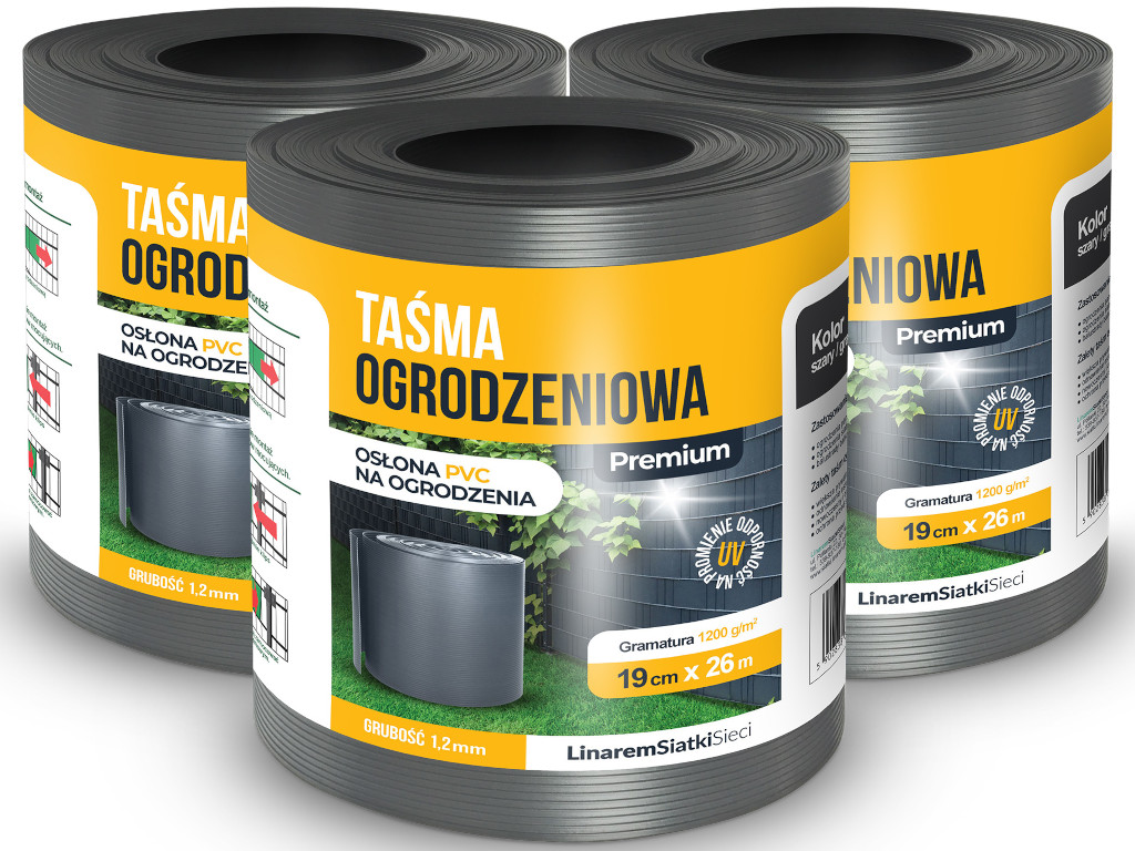 Taśma Ogrodzeniowa Premium 1200g/m2 Linarem SiatkiSieci w rolce 19cm x 26mb. Kolor antracyt/grafit RAL 7016