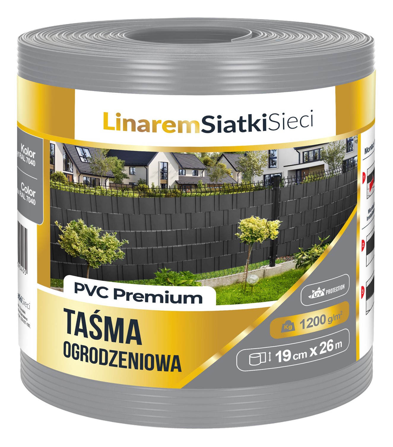 Taśma Ogrodzeniowa Premium 1200g/m2 Linarem SiatkiSieci w rolce 19cm x 26mb. Kolor szary RAL 7040