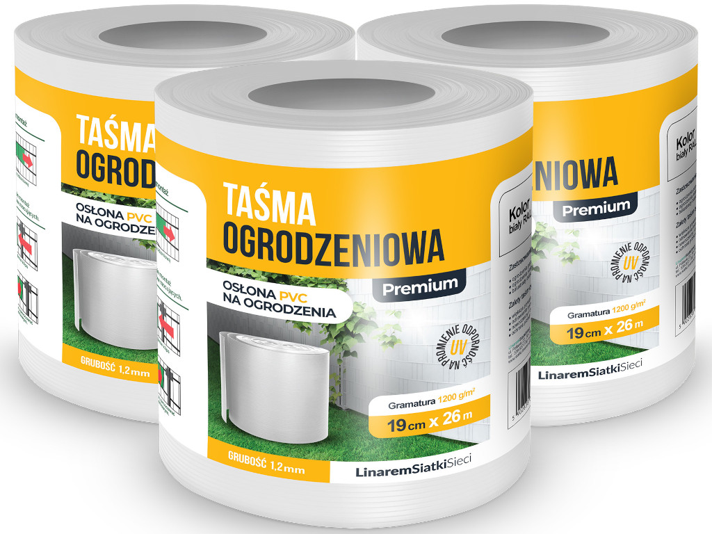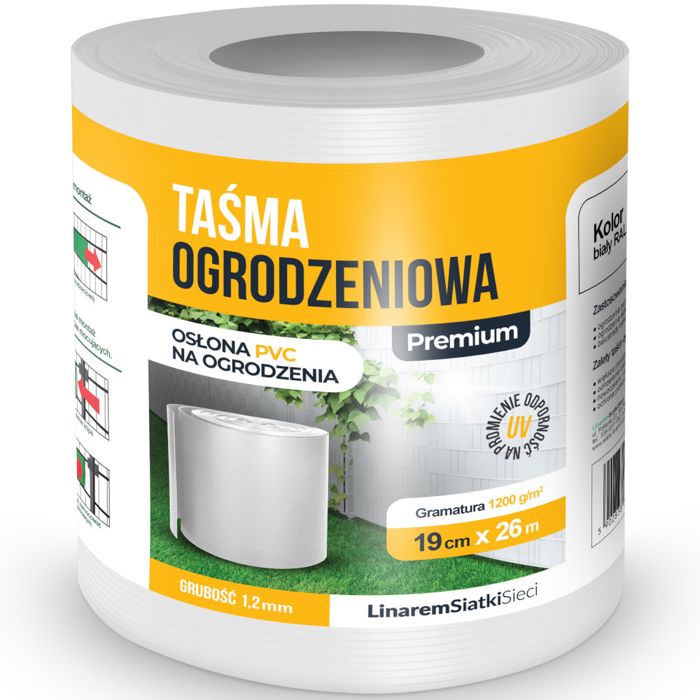Taśma Ogrodzeniowa Premium 1200g/m2 Linarem SiatkiSieci w rolce 19cm x 26mb. Kolor biały RAL 9003