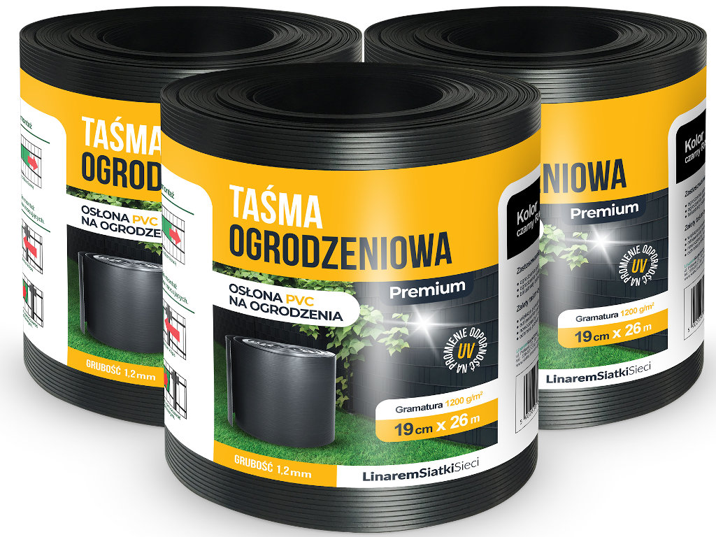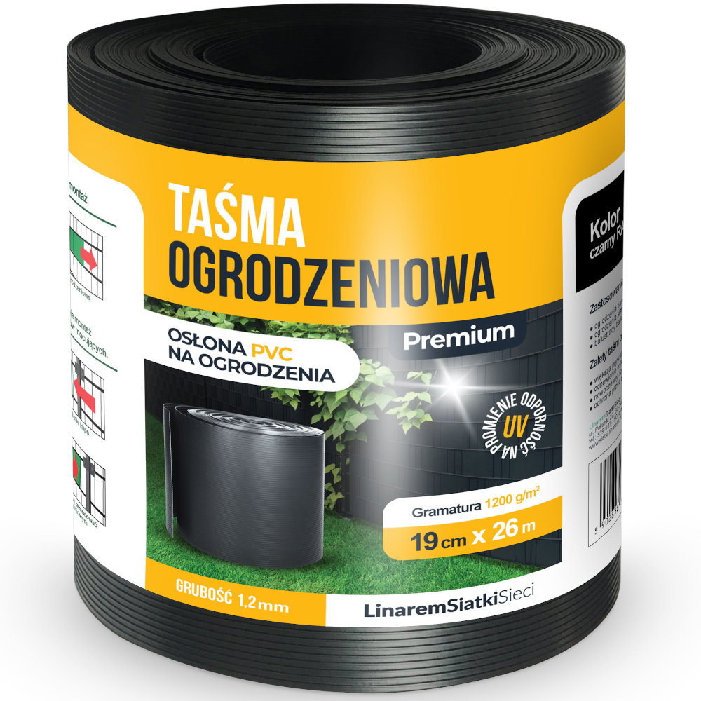 Taśma ogrodzeniowa Premium 1200g/m2 rolce 19cm x 26mb w kolorze czarnym RAL 9005 marki Linarem SiatkiSieci. Zwiększona odporność na UV i warunki atmosferyczne. Odpowiednia do standardowych paneli ogrodzeniowych.