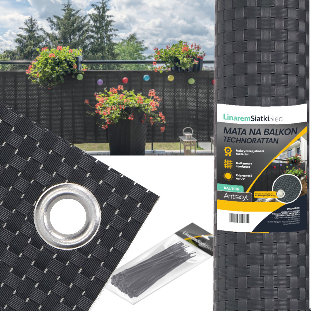 Osłony balkonowe to w ostatnich latach to najpopularniejszy wybór do osłonięcia każdego rodzaju balkonu lub tarasu w celu zapewnienia sobie większej prywatności, osłony przed słońcem, wiatrem lub dodatkowego zabezpieczenia przed wypadnięciem zwierzęcia lub elementów znajdujących się na balkonie. Osłony w wersji technorattanowej zapewniają dodatkowo funkcję estetyczną dzięki swojemu unikalnemu wzorowi i głębokim kolorem. Maty Linarem SiatkiSieci posiadają stabilizację UV co znacznie wydłuży żywotność materiału i ograniczy utratę koloru przy ekspozycji na słońce. Materiał z którego wykonane są osłony balkonowe jest odporny na warunki zewnętrzne niezależnie od pory roku oraz nie wymaga specjalnej konserwacji. Dodatkowym atutem jest prosty montaż za pomocą dołączonych opasek zaciskowych.