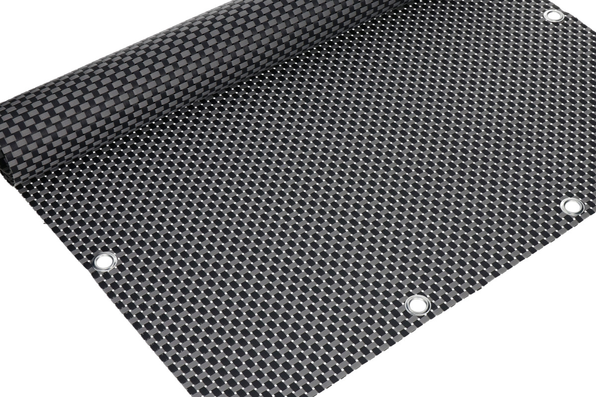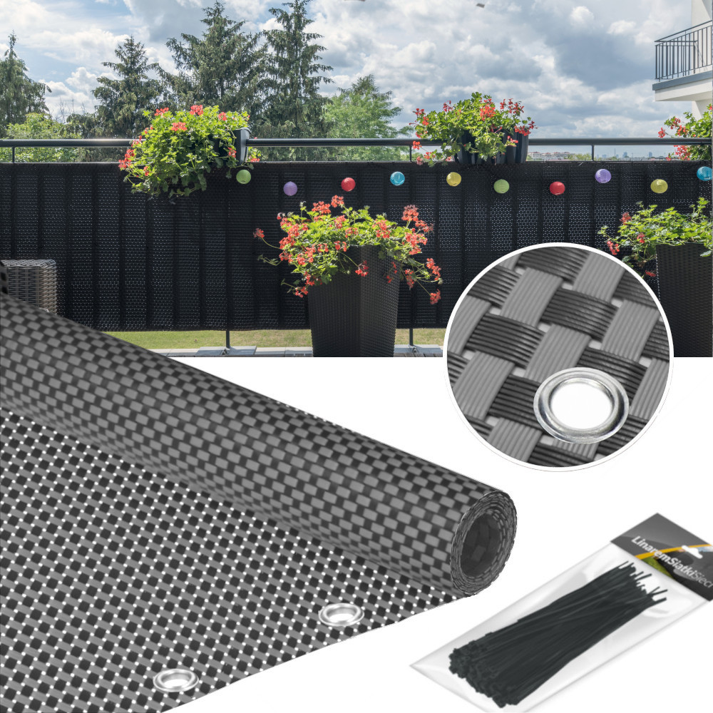 Grafitowy kolor maty jest najpopularniejszym kolorem pasującym do niezwykle często spotykanych grafitowych lub antracytowych barierek na balkonach. Zwarta struktura rattanowa materiału zapewni odpowiedni poziom prywatności, ochrony i zacienienia przy okazji nie tworząc pod wpływem silnego wiatru tzw. "żagla" i nie obciążając barierek. Twój balkon lub taras nabierze estetycznego i modnego wyglądu w uniwersalnym kolorze grafitowym dodatkowo osłaniając przed niepożądanym widokiem z zewnątrz. Mata balkonowa montowana na barierkach osłoni również Twoją przestrzeń przed nadmiernym nasłonecznieniem, podmuchami wiatru, śniegiem, kurzem i innymi zanieczyszczeniami pochodzącymi z zewnątrz oraz wpłynie na akustykę osłoniętego obszaru.