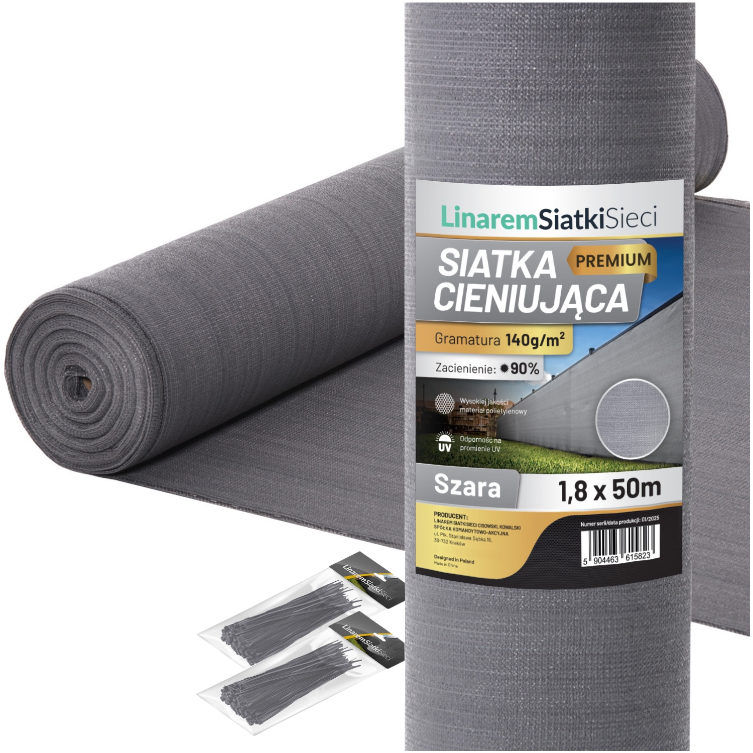 SIATKA CIENIUJĄCA 90% 1,8m x 50m LINAREM SIATKISIECI 140g/m2 W KOLORZE SZARYM