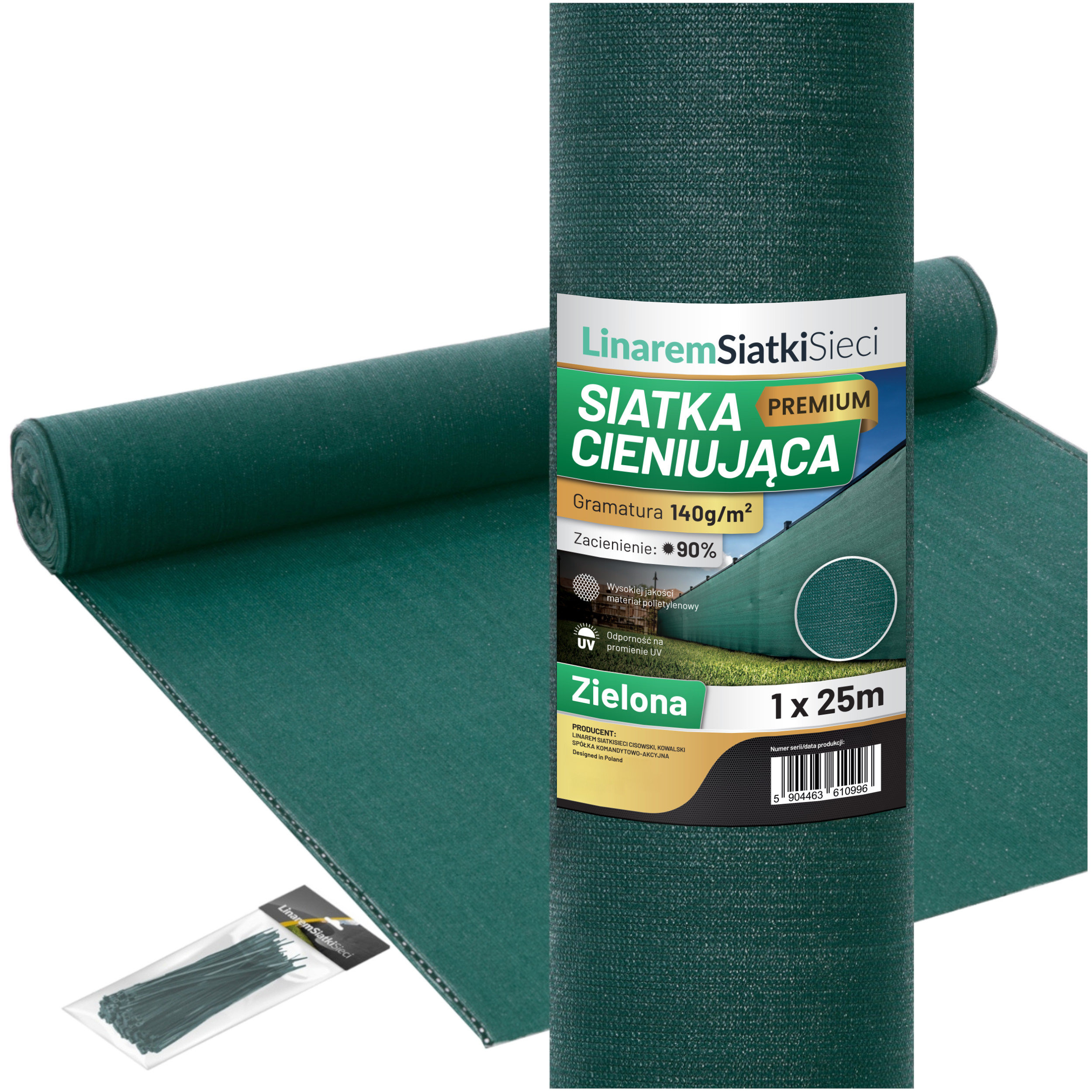 Zielona siatka cieniująca w pełnej rolce 1x25m o gramaturze 140g/2 o podwyższonym standardzie wykonania Linarem SiatkiSieci® z przeszyciami wzmacniającymi oczka montażowe oraz dodatkową ochroną UV+. Siatka maskująca stosowana głównie jako osłona na ogrodzenia. Opaski zaciskowe do montażu w komplecie.