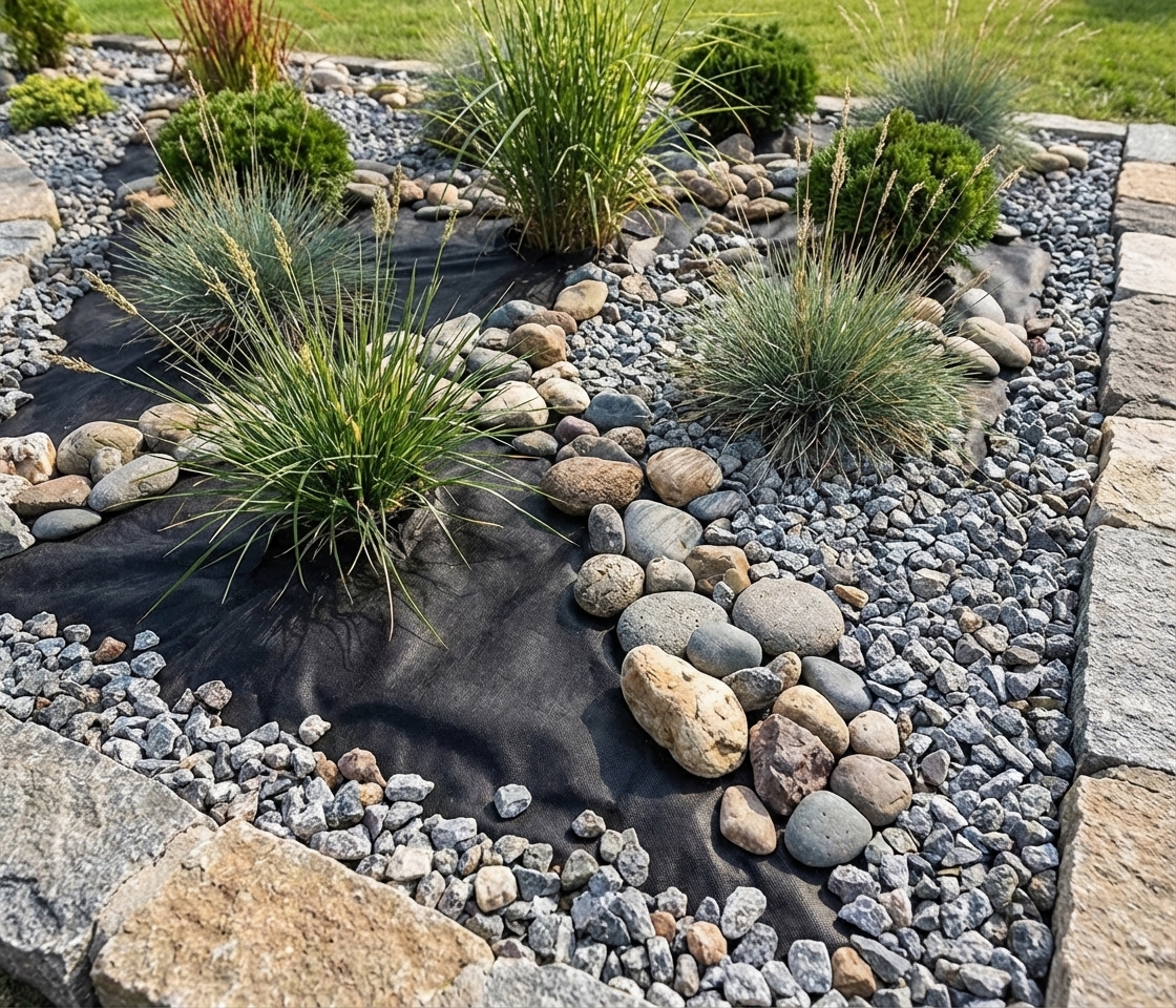 KROK IV. Przysyp agrowłókninę korą dekoracyjną, kamieniem ozdobnym, żwirem lub innymi elementami dekoracyjnymi, dopasowanymi do aranżacji ogrodu.
