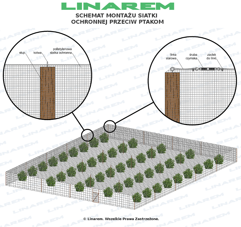 Siatki zabezpieczające przed wronami wykonane są z polietylenu. Polietylen to wytrzymała odmiana tworzywa sztucznego odpornego na warunki zewnętrzne takie jak opady atmosferyczne, promienie UV oraz zimne i wysokie temperatury. Polietylenowe siatki ochronne na wrony gwarantują ochronę plantacji, uprawy czy sadów przez wiele sezonów. Struktura siatki przeciw wronom składa się z dwóch zaplecionych ze sobą żyłek (2 x 0,2mm). Oferowana przez naszą firmę siatka ochronna przeciw wronom wyróżnia się lekkością (12g/m2) a oczka siatki ochronnej na wrony układają się w romby co zapewnia jej większą rozciągliwość i elastyczność.