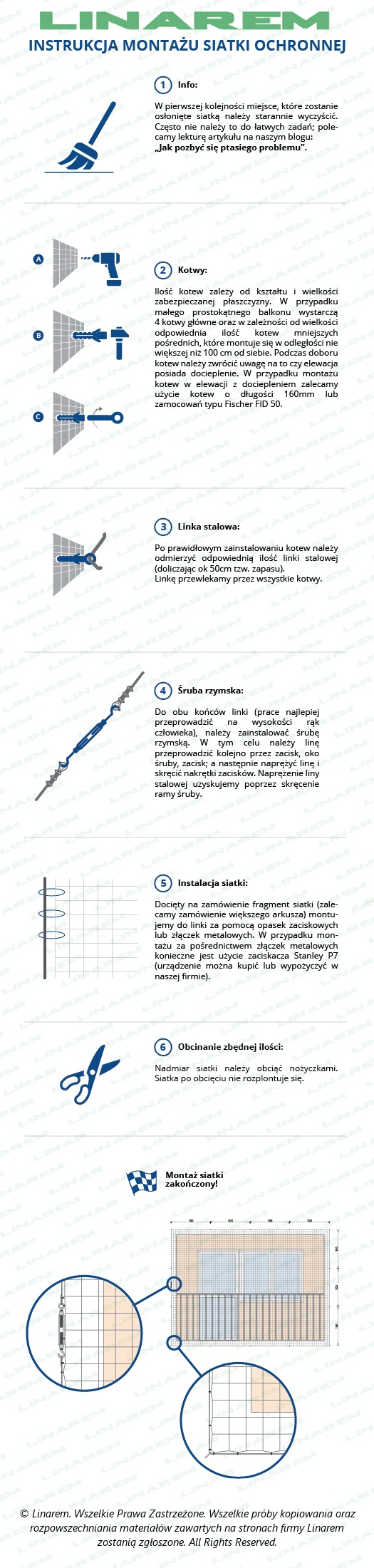 Haczyk pośredni jest uzupełnieniem kotw głównych mocowanych na rogach balkonu lub okna. Przez zamontowane do elewacji kotwy przewlekamy linkę stalową, którą następnie należy naprężyć śrubą rzymską. Tak wykonany szkielet jest gwarancją stworzenia solidnej, sztywnej konstrukcji.