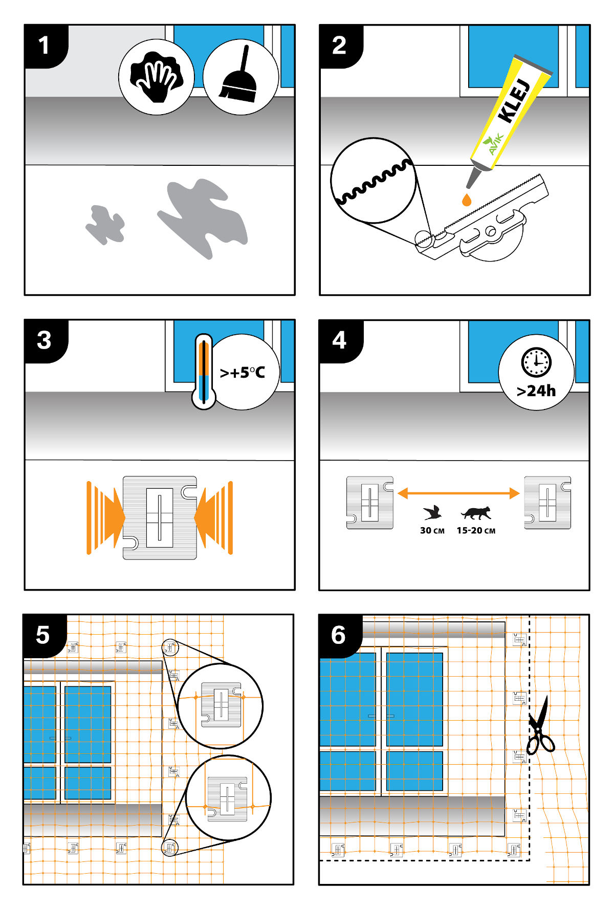 Siatka świetnie łączy się z akcesoriami montażowymi AVIK (klej i zaczepy poliwęglanowe) do łatwego bezinwazyjnego montażu.