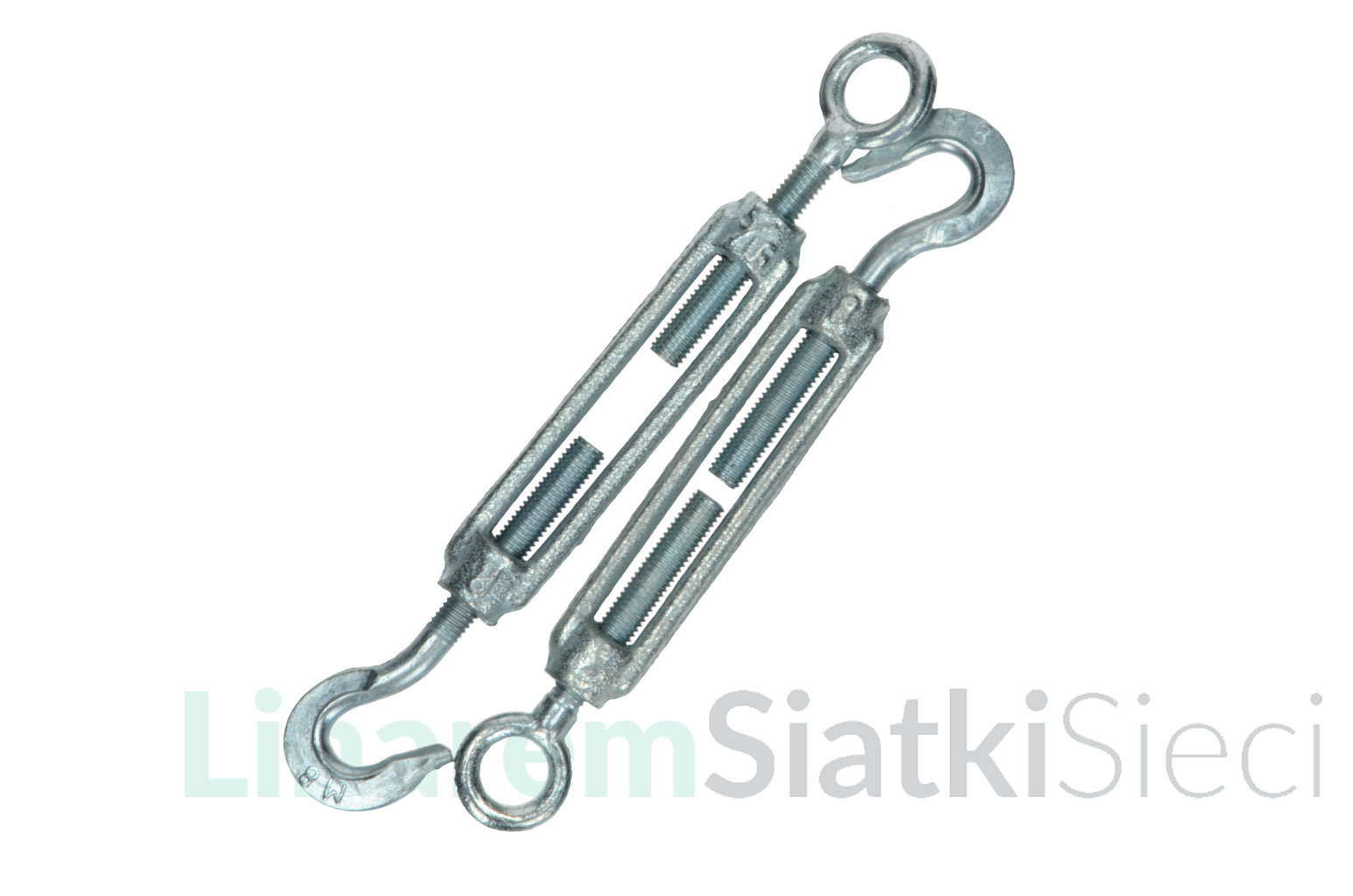Śruby rzymskie M8 wykonane ze stali ocynkowanej (śruby nierdzewne) odporne są na korozję. Dwie śruby połączone są ze sobą za pomocą ramy. Pręty są nagwintowane na końcach w kierunkach przeciwnych, przy skręcaniu ramy śruby zbliżają się ku sobie.